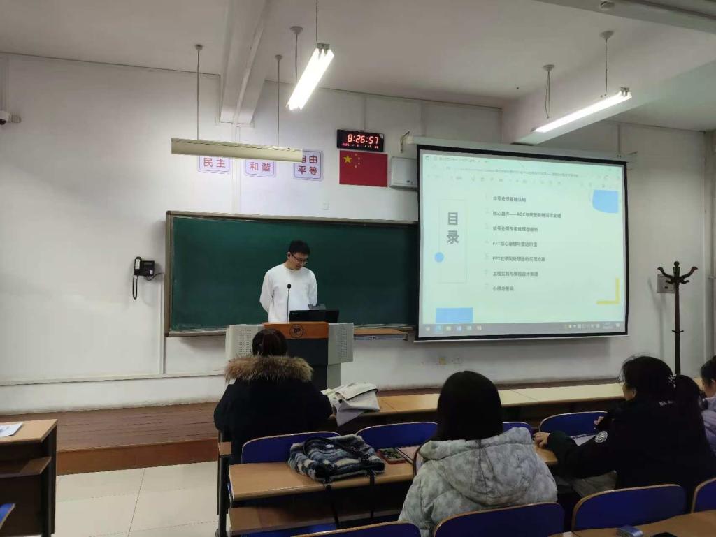 2026年1月5日,信息工程学院在金川校区教C204,分别面向电子信息工程23级本科生、通信工程23级本科生举办关于信号处理工程应用的讲座,主讲人为内蒙古方向图科技有限公司的硬件工程师王海洋,讲座题目为《雷达信号处理中DSP与FPGA应用及FFT实现》。主讲人从信号处理基础认知、采样定理与芯片、信号处理器件、FFT原理、信号处理工程实现方案等方面,结合实际雷达系统,全面讲解了信号处理基本理论方法及其工程实现,介绍了ADC、DSP、FPGA等器件的特点和应用方法。讲座内容兼顾理论深度和工程应用,引起了在场学生的广泛兴趣。