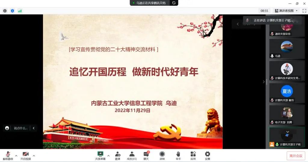 举办专题夜校。12月3日,信息工程学院“学习贯彻党的二十大精神专题夜校”开班。学院党委书记乌迪围绕“以党的二十大精神为引领,在推动学校高质量发展中展现学院新作为”主题,从党的二十大报告的总体框架、突出亮点、以党的二十大精神为引领指导实践3个部分与学院全体教职工进行学习交流,通过线上领学宣讲进一步深化对党的二十大精神核心要义的领会把握。12月4日,组织教职工参观“亮丽内蒙古,奋进新征程,学习宣传贯彻党的二十大精神”网上主题展。学院专题夜校后续将陆续开展专家宣讲、观看政论专题片、主题知识竞赛、撰写评论热议等活动,不断深化学习实效。