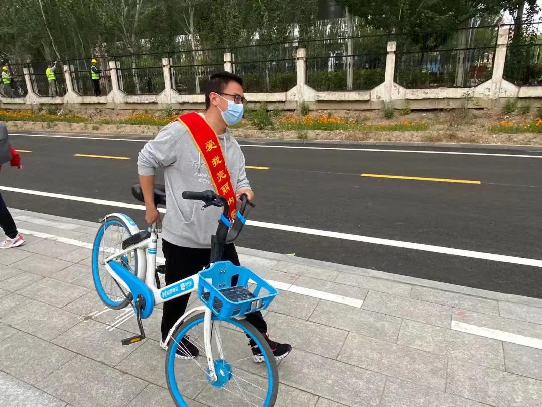 在教学楼外,志愿者们抬起蓝色的小蓝车,从远处搬到了共享单车的摆放点,将树坑中内不起眼的小垃圾扔进垃圾桶里,不一会儿笑内零零星星出现的小蓝车被摆放的井然有序,地面上的垃圾也不见踪影。