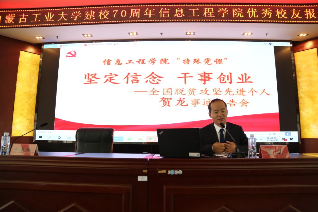 校友贺龙讲述了他研究生毕业,怀揣梦想,踏入基层,投入国家脱贫攻坚战,努力拼搏奋斗的感人经历。2012年,他从内蒙古工业大学马克思主义学院硕士研究生毕业后,同年在学校研究生工作部实习。2013年,他放弃了城市优越的生活条件,到国家级贫困县乌兰察布市兴和县县委办工作,任县委办秘书。2015年,他主动请缨到革命老区深度贫困村兴和县店子镇朱家营村担任“第一书记”,高尚的情操,无私的奉献精神,忠于党的坚定决心,使他全身心投入到脱贫攻坚事业。2018年6月他荣获兴和优秀第一书记、标杆清风干部称号,11月市委组织部推荐为自治区“三个百优”村支部书记。2019年先后被评为第三届“内蒙古青年创新创业创优”脱贫攻坚一线标兵个人、乌兰察布市优秀党务工作者。2020年被授予“内蒙古自治区先进工作者”称号。2021年被党中央授予“全国脱贫攻坚先进个人”荣誉。贺龙的感人事迹,朴实无华的演讲,动人心弦,催人奋进,让全体师生心灵受到强烈震撼。