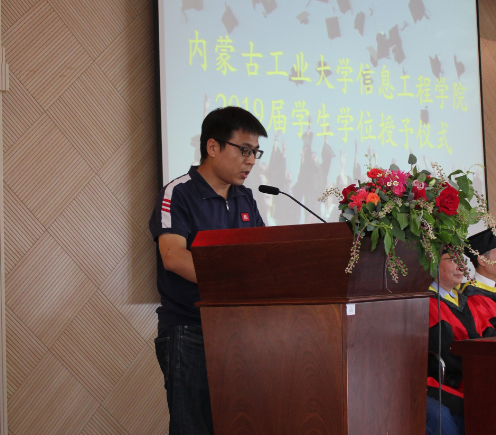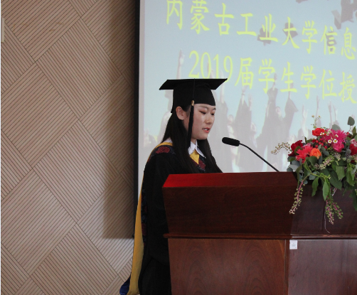 学位授予仪式在铿锵雄壮的国歌声中拉开序幕。学院党委书记王彩玲宣读《关于对2019年优秀硕士论文、本科毕业设计获得者及指导教师表彰的决定》。学院领导为获奖教师及同学颁发荣誉证书。物联网系教师黄建伟、计算机15-1班刘赟、电子17-1班董国钰分别代表教师、毕业生、在校生进行发言。