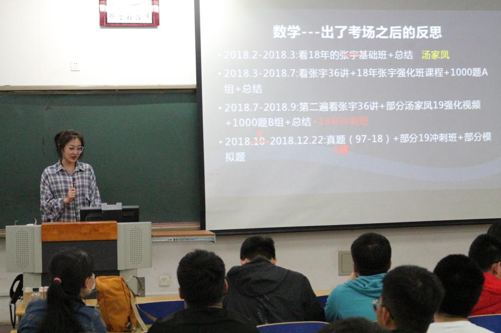 计算机15-1班侯坤睿同学讲述了自己的考研经历,她从四个方面展开介绍。一、明确为什么考研,她告诫同学们想法一定要切合实际,一定对自己有一个正确的评估,否则有可能会一时上不了岸的;二、正确评估自己的学习,方法一定要科学,符合自己的特点;三、踏踏实实备考。她从数学、英语、政治、专业课四个方面详细的分享了当时她的学习方法和学习资料,并告诉学生们一定要调整好自己的心态。四、准确定位学校,一定要认真查阅学校资料,多打听,多询问,少走弯路。