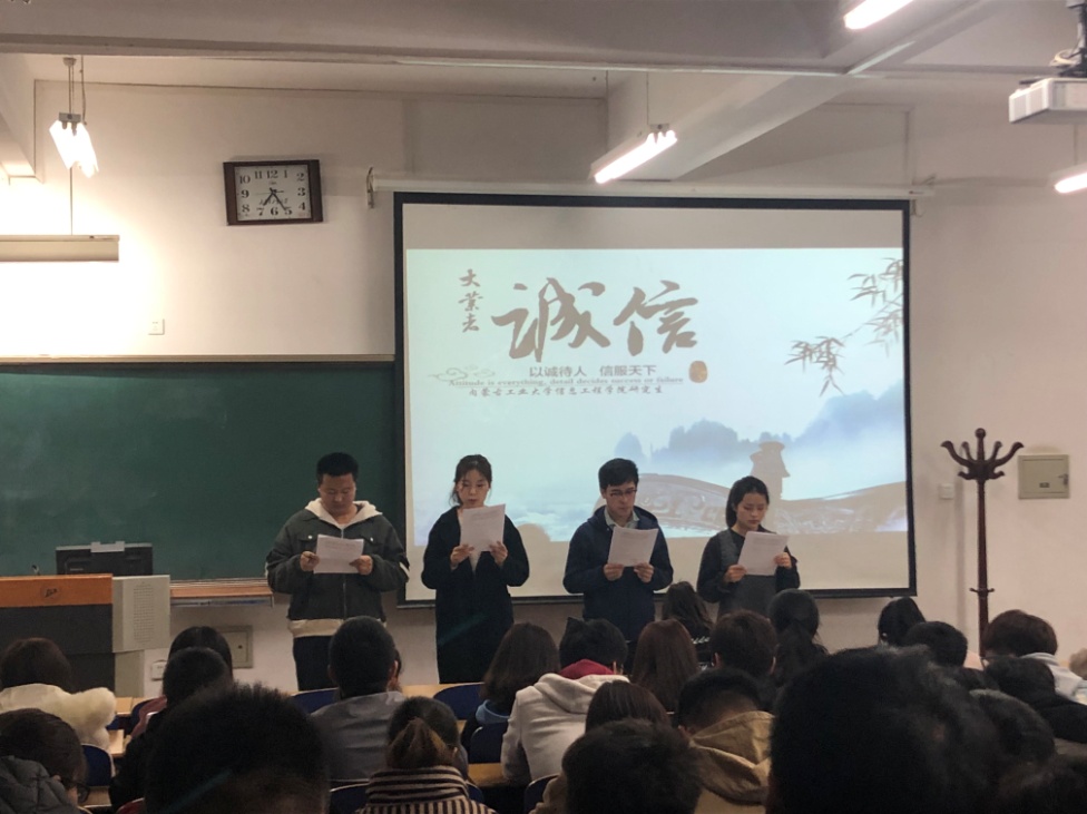 交流会上,学院全体研究生观看诚信教育记录片、内蒙古工业大学研究生纪律手册宣讲、各专业小组讨论、代表发言四个环节。