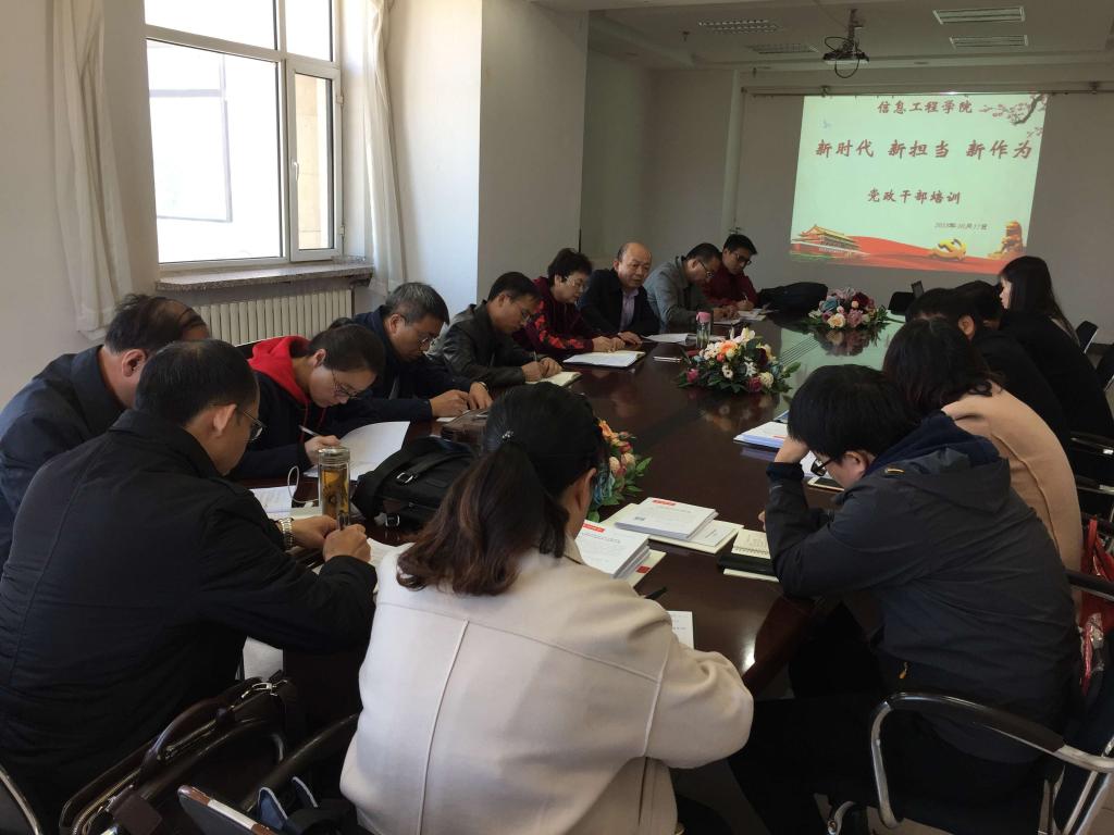 根据学院党委2018年度干部教育培训工作安排,10月17日下午,我院举办“新时代·新担当·新作为”党政干部培训。学院领导王彩玲、李春明、王金彪出席培训,全体系主任、科级干部、党支部书记参加培训。