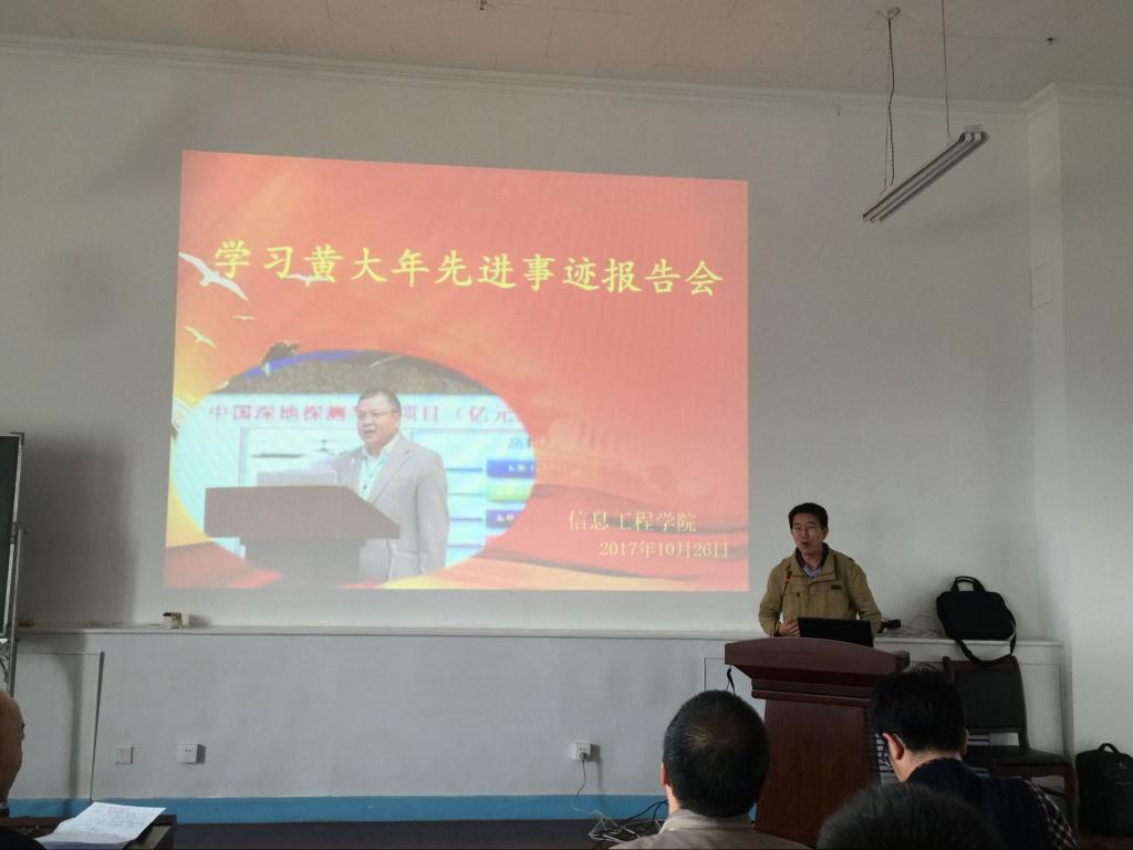 我院邀请矿业学院地质工程系教师高成做题为《我所认识的黄大年老师》的专题报告。高成在吉林大学地球探测科学与技术学院应用地球物理系攻读硕士、博士期间与黄大年教授在同一专业,通过细致讲述黄大年教授放弃国外的优渥生活毅然回国,时刻把国家利益和需求放在首位,将“科技强国、振兴中华”的赤诚报国之念牢记心中,带病工作,顽强拼搏的经历,从多角度为我们诠释了黄大年教授“心有大我、至诚报国”的爱国情怀,“淡泊名利、敢于奉献”的高尚情操,“教书育人、敢为人先”的敬业精神。