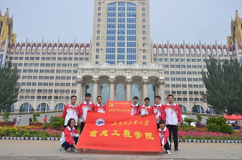 然后,党小组在2017年9月3日上午8.30准时达到了电力大楼正门前,身着统一的红色鲜艳服饰,统一佩戴了党支部准备的内蒙古工业大学工作证,在电力大楼阶梯旁挂立了本支部党旗和信息功能工程学院的大旗,能够让新生们明显的注意到我们,在我们帮助他们时,他们可以没有顾虑的接受我们的帮助,我们也能够同时代表学院来帮助新生。