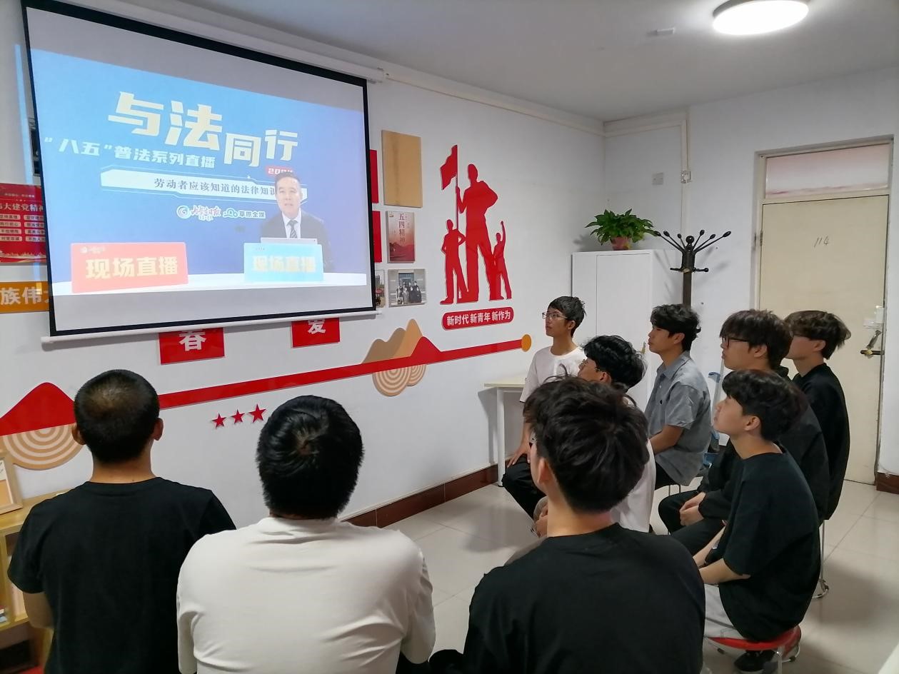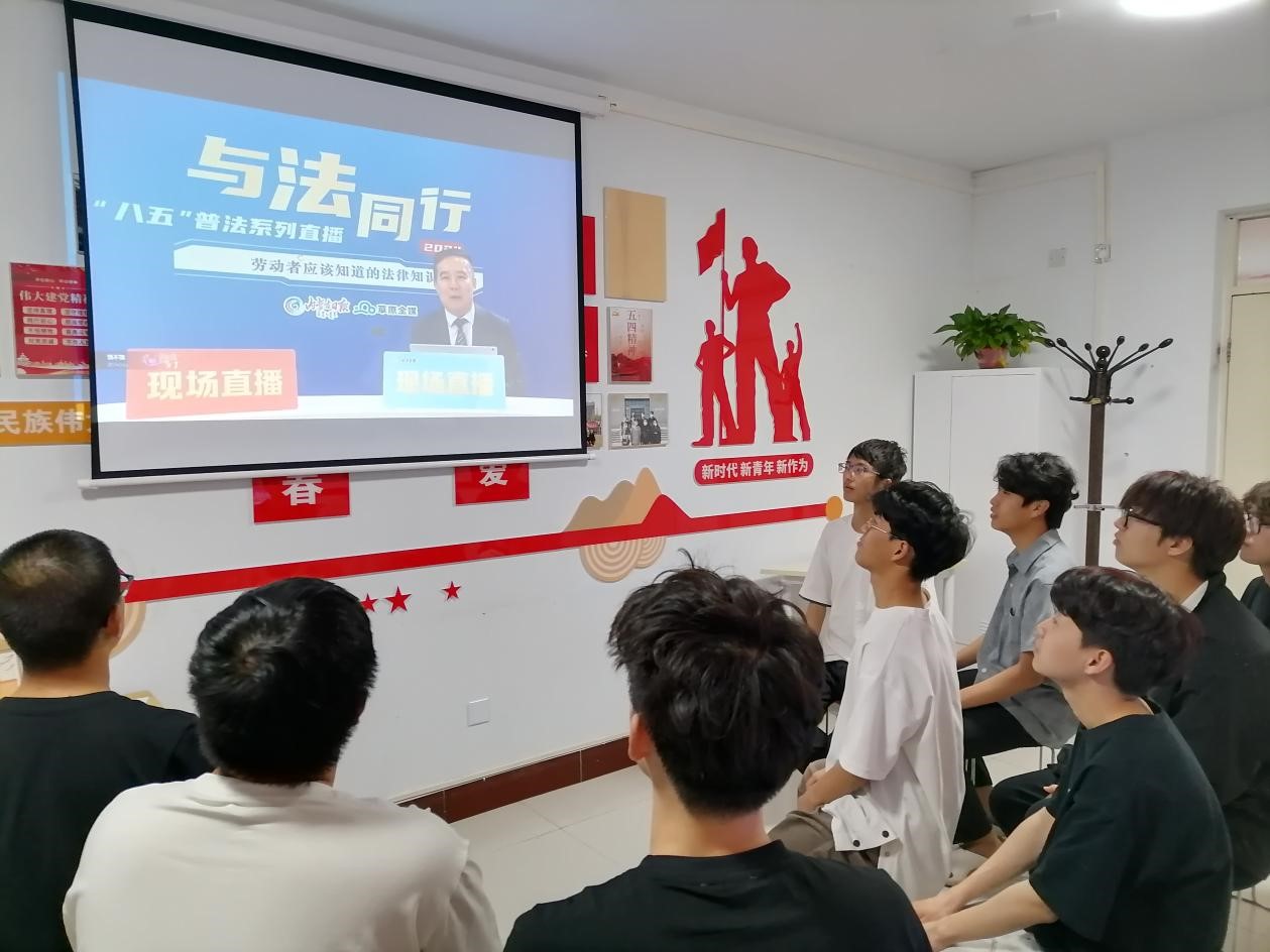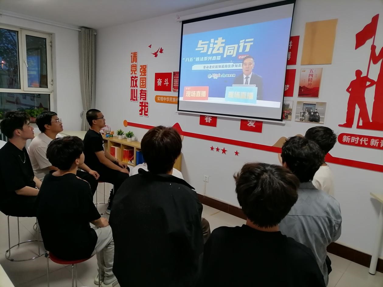 为推进全面依法治国,切实把习近平法治思想贯彻落实到全面依法治国全过程,落实普法责任,加强普法工作。4月29日晚,信息工程学院组织学生在北二“一站式”学生社区、宿舍及线上观看了主题为“与法同行——劳动权益保护法”的公益直播课。