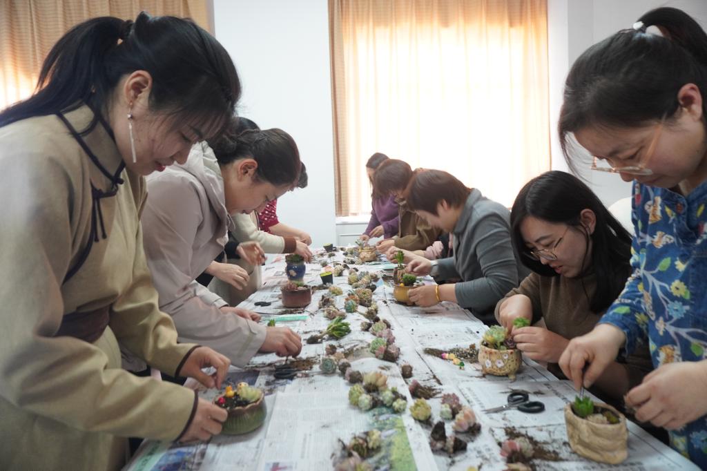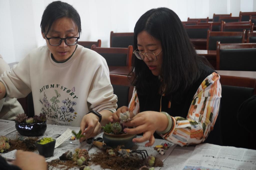 活动中,老师为大家讲解多肉栽培养护知识、种植方法与步骤。女教工们热情参与,精心挑选多肉植物,搭配砂石和土壤,制作出一盆盆精美的多肉盆栽。