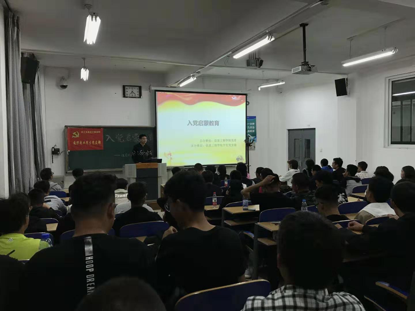 2019年9月25日通信专业学生党支部、 电子专业学生党支部、计算机专业学生党支部分别在教A102、教A105、教A104举行新生入党启蒙教育大会,出席会议的有三位学生党支部书记、支委会成员及19级全体新生。