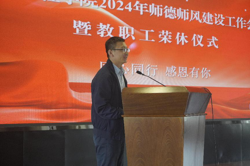 此次会议聚焦于师德师风建设与提升,刘建国书记强调“十项准则”是高校教师履行职责的基本规范,以实际行动诠释教书育人的崇高职责;同时还举行了教职工荣休仪式,学院领导为退休教师颁发了荣休纪念牌并赠送鲜花,表达了学院对退休教师们深深的敬意和祝福。退休教师和在职教师代表发表讲话,表达了对教育事业的热爱和对未来的美好展望。