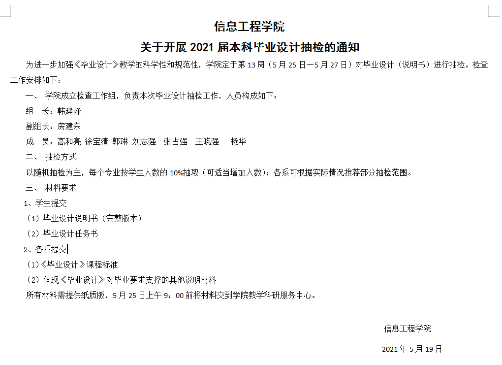 信息工程学院关于开展2021届本科毕业设计抽检的通知